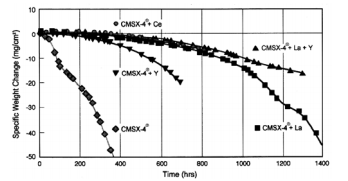CMSX-4 [La+Y]合金隨后被引入,以知足日趨增加的策念頭熱截面渦輪部件的設想請求。出格感樂趣的是改良裸合金氧化機能,以削減葉尖和外部氧化,并改良熱障涂層(TBC)的粘附性。反映性元素增加的評估標明,增加鑭(La)和釔(Y)能夠明顯改良CMSX-4裸合金(硫含量為s2 ppm)的氧化行動(圖11)[29]。這些活性元素連系硫和磷作為不變的硫化物/磷化物,對氧化鋁垢的粘附有有益的影響。