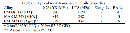 cm681 LC各種合金或然EO MAR M 247和EO CM 247 LC鋁合金的標桿常溫拉申身體機能見表6。cm681 LC和MAR M 247的破裂耐用度剖析右圖8所顯示。
