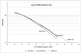 圖 9 – DS CM 186 LC、DS CM 247 LC 和 SX CMSX-2/3 的 Larson-Miller 扯力破裂保修期